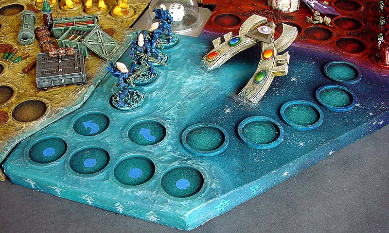 Blue team is painted as Eldar Dire Avengers and the board edge is decorated with Warlock symbols. The warp game is heavily tilted to minimize vertical dimension. This allows players to reach the dome more easily and makes storage easier. The space is black cloth (fabric of space ;-P) which was airbrushed to present a transition from an Eldar cosmic Webway into solid ground.