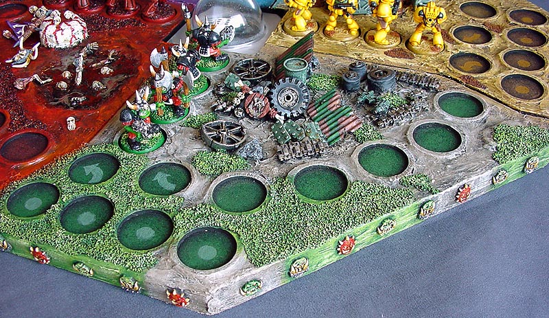 Green is Mean. Orcs are naturally the Green team. The board section is quite traditional with green flocking and mud. The edge is decorated with Fantasy Battle orcs' shield faces.