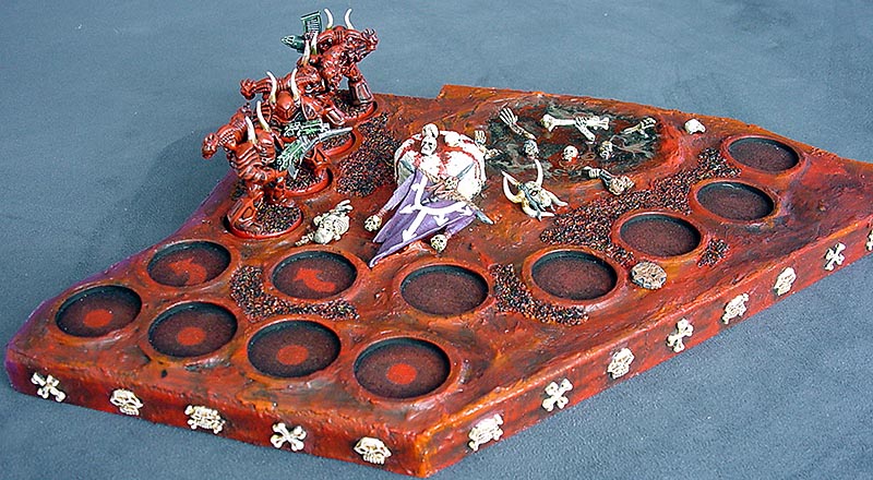 Fire and Brimstone. Chaos makes a natural Red Team. Lots of red and flocking painted as lava. The edge is decorated with skull and bone bits from undead figures. Other undead bits were used to theme the section.