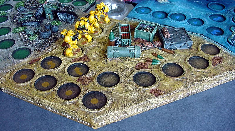 Yellow Team. Space Marines are a great "race", because they can be pretty much of any color, so the remaining color, yellow, was filled with the assistance of the Imperial Fists Space Marine Chapter. The board is a desert themed supply depot. The edge is decorated with some latin as is traditional for Space Marines: "Sic hoc adfixum in obice legere potes, et liberaliter educatus et nimis propinquus ades." I could translate it for you, but that would defeat the meaning of the saying.