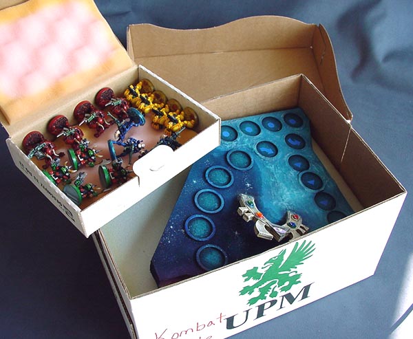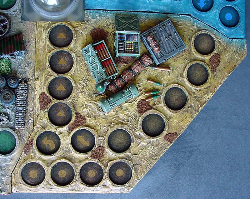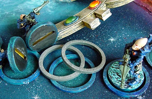 Sixty plastic rings were cut with a bandsaw from a plastic tube that was slighly bigger than a standard slotta-base. Figures were glued on upside-down bases to make them go more easily into the rings.