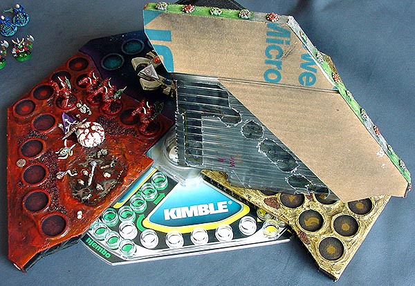 First of all, the board was constructed of four sections that fit over a regular Kimble board. A much easier solution would have been to make four sections with flat bottoms and model a shallow dice cup in the middle (themed as the Eye of Terror, of course), but the harder approach was selected because you have to have the Pop-o-matic dome or else it just isn't Kimble.