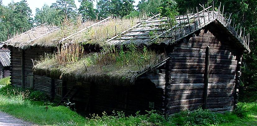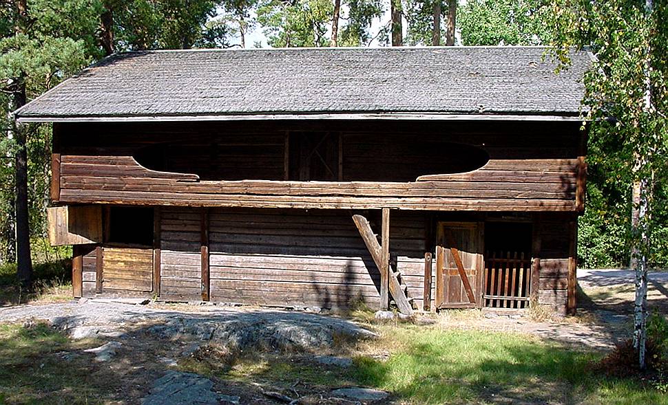 Here's an example of a two-storey building. Judging from the doors, the lower part is used to keep animals. The upper floor is a storage space. The roof is made of shingles.
