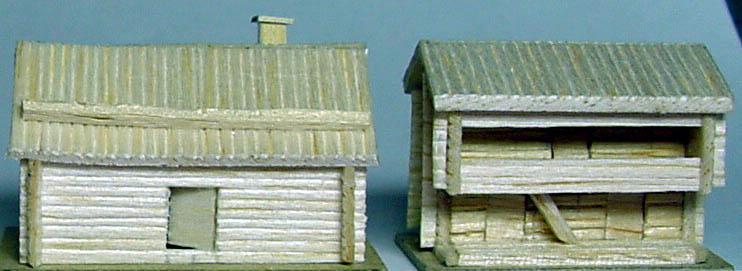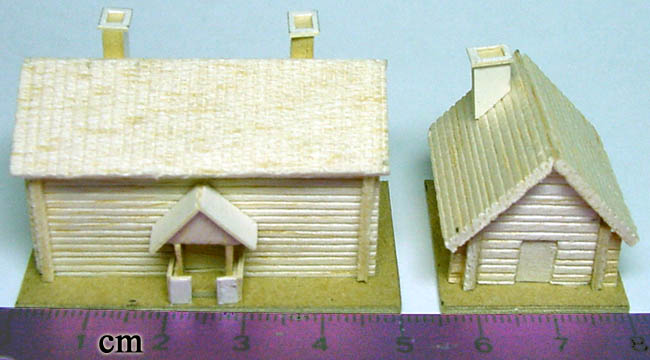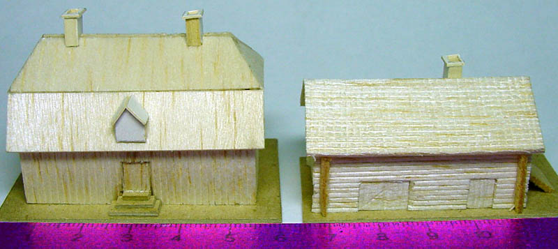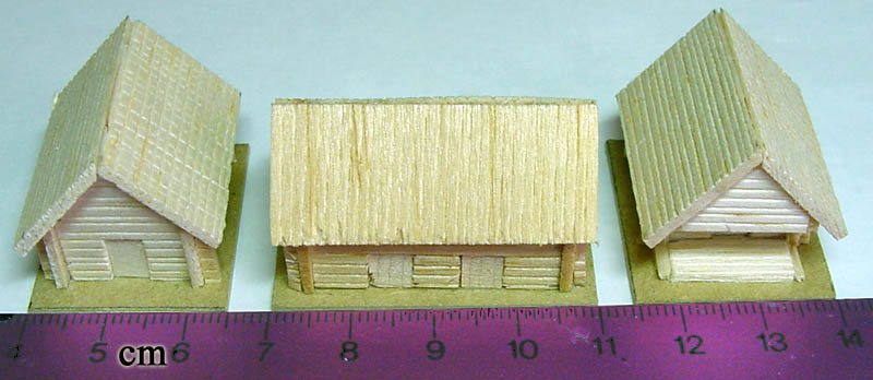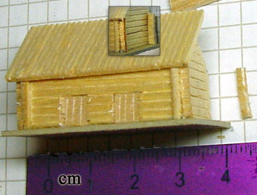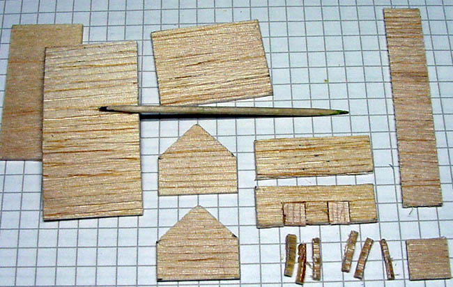 Materials needed for buildings in this scale (roughly 1:150) are simply balsa and card. In addition to obvious tools, a toothpick is handy for simulating gaps between logs or panels.