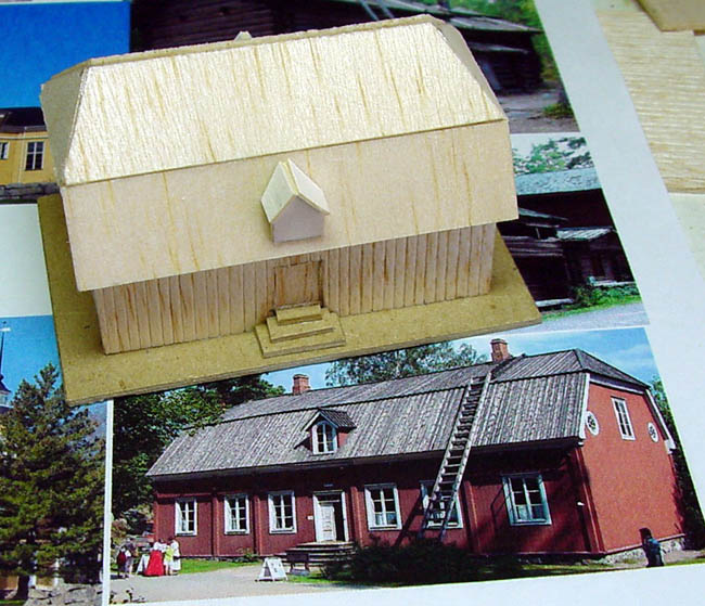 Here is the vicarage in the building phase. The real building has a log frame from which the overlapping corner logs have been sawed off before the walls were covered with vertical lumber paneling. The roof is made of vertical lumber, but as it doesn't have strong texture, the model building doesn't have any extra texture put on it - just whatever texture the balsa has naturally.
