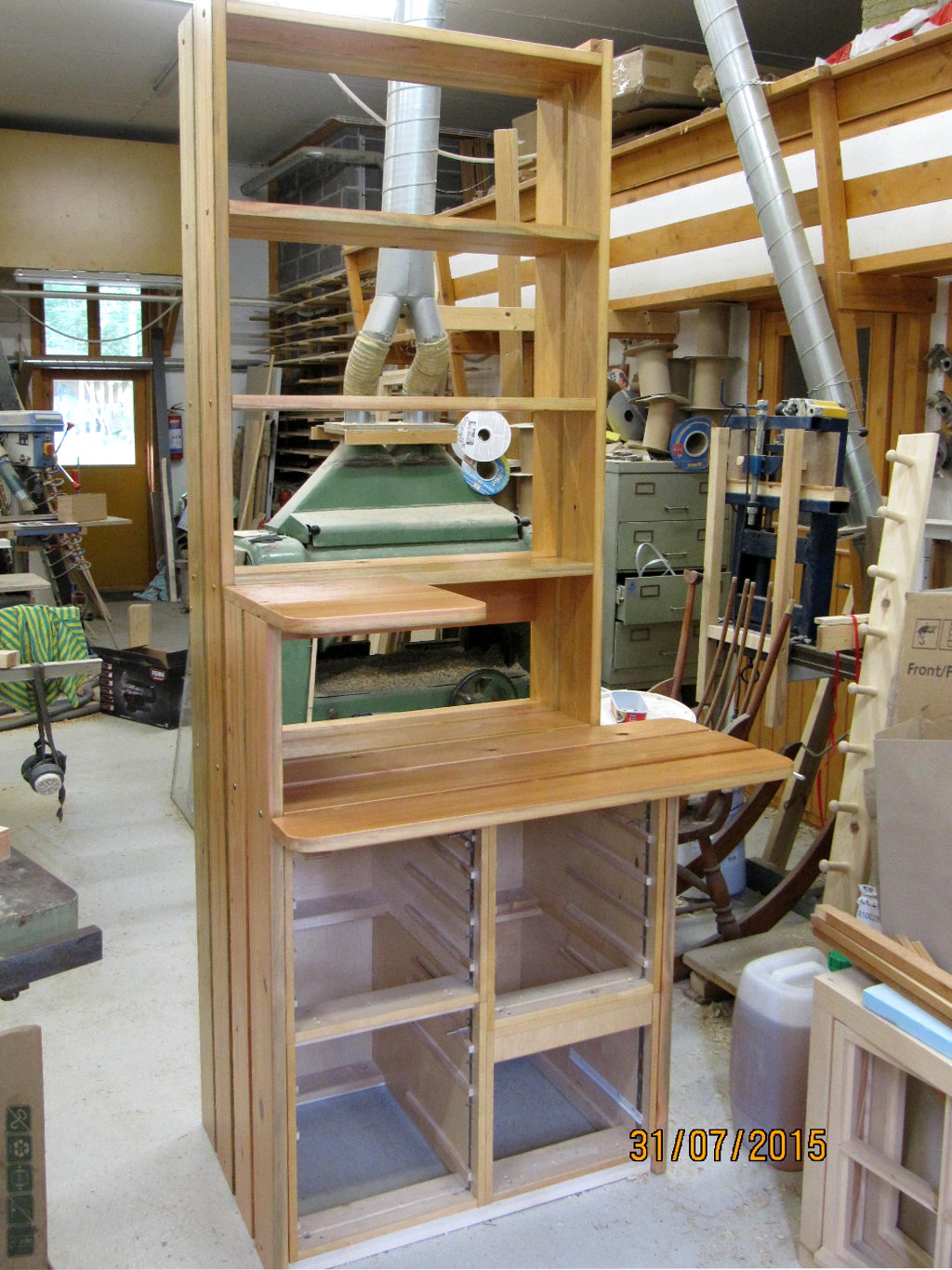 Tässä on pöytätason alle upotettu käytetyt laatikostot. Itse hyllykkö on tehty vanhan maalaistalon ulkovuorilaudoista. Näin osa talon historiaa sai jatkoa talossa, nyt sisätiloissa. Puu oli todella tiukkasyistä honkaa. |